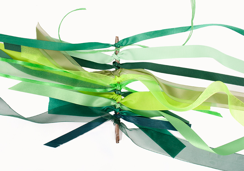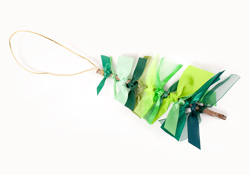 * Featuring: Various Green Ribbons & Gold Tinsel (used for hanger)