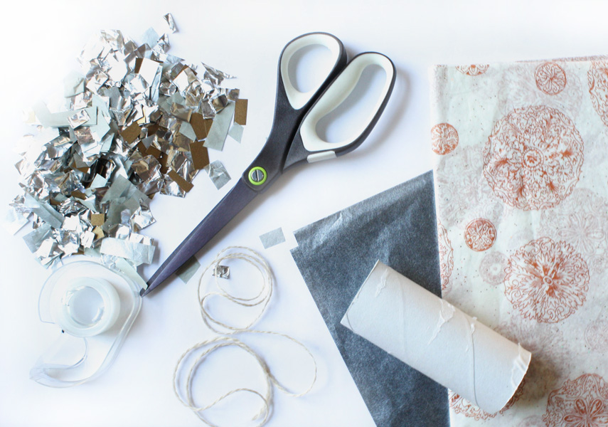 Scissors, Tissue Paper, Tape, Paper Towel Or TP Roll, String Or Curling Ribbon, & Confetti