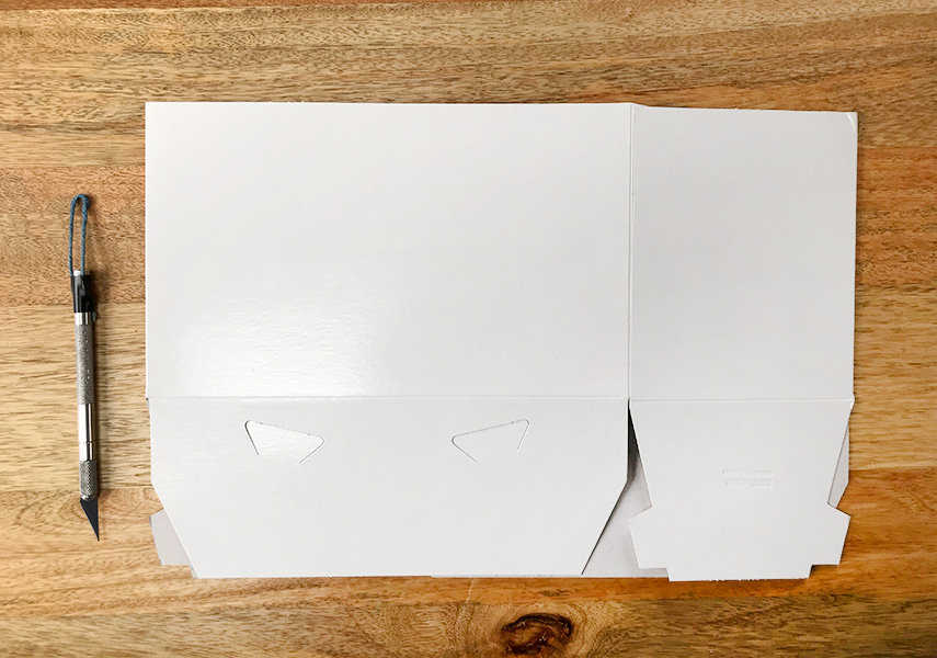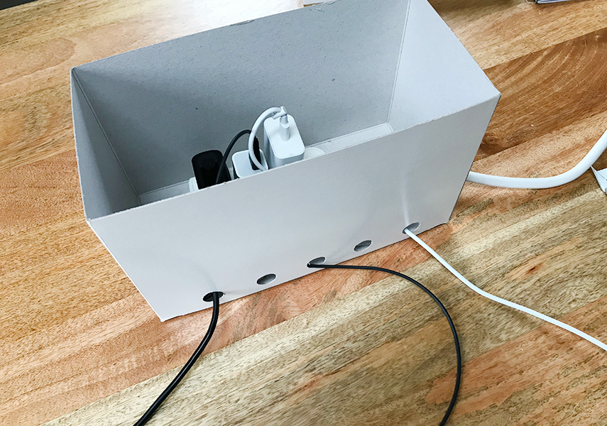 Using a craft knife, make holes at the base of the box for the cords to come through. An additional (larger) hole on the side of the box is needed for the power cord.